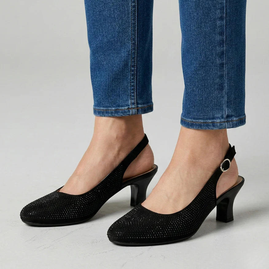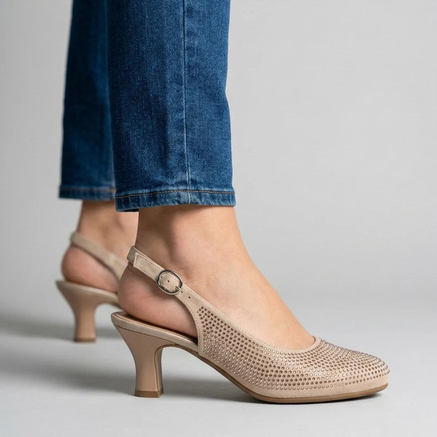 Chiusura: Cinturino slingback regolabile con fibbia metallica laterale.